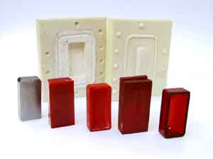 For both taillights first I milled a steel original (far left). A silicon mould has been made out of it (back). Blending 2-component epoxy casting with pigment didn't get me the right brightness and transparancy (middle block). Ultimately I perspex-glued bright-red sheets (block four) and milled them (far right). Each taillight has three light bulbs: two serve as taillight, the third (halogen) serves as brake light and indicator. |