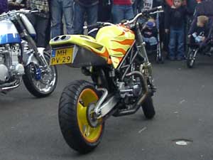 Rob Veltmans 'Harley Fighter', bases on a 1200cc Sportster engine and selfbuilt frame did appeal to me at the previous Street or Track. I liked the original matt black more than this yellow-orange-flame paintjob. The jury rewarded it third place. | |||