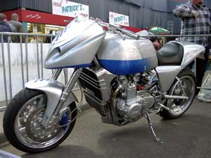 The event had some, well ... 'very special' bikes, like this Bakker Grizzly. Nice forks, nice wheels, nice engine. A pity the all-over design hurts the eye. Although it was on the Street or Track poster, fortunately it didn't keep all the visitors away. | |||