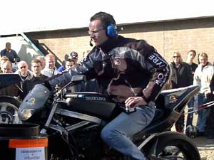 Like last year Antillian dragracers came to the event and enjoyed the crowd. This GSX-R's acceleration while injecting the nitrous oxide was so abrupt the tyre just slipped over the roll. But 230Hp and 252Nm are still impressive figures. | |||