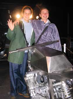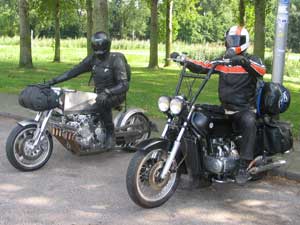 My good friend Max Croot (on the left) entered the ring with his snowmobile (!). A 1000cc twostroke 3 cylinder Polaris engine with NOS; no less than 335bhp the belt puts on the tarmac. Very spectacular and the first one in Britain. On his right you see Mick: the team's fulltime Chief Beer Tester and parttime mechanic. |
