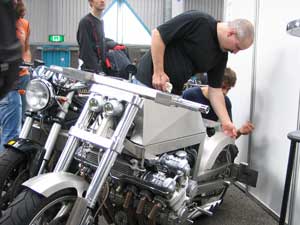 Organizer Jon Tober interviewed builders on stage. Here you see Antoinne with his modified TL1000. | |||