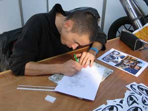 Antoinne Collignon, the famous French bike cartoonist, worked concentrated on a new drawing. | |||
