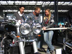 And we took our work very serious. Here you see Sabine and Seroj studying a very special RGV250 powered by a DR800 onecylinder engine. The thought 'I sure would like to ride this bike' is always a big plus. We rewarded it with the 'René Tober Award'. | |||