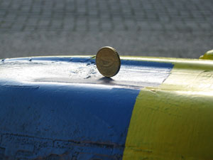 His bike looks like it might fall apart any moment. But appearances are deceptive: the engine runs so smooth a coin will stand on its side while it's running, even when it's revved up. Not even starting the bike will make it drop. That's finetuning! |