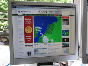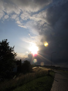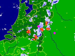 This is a screendump form buienradar, on Saturday June 18 juni 2011 at 18.55h. The purple dots are beginning and end of the trip. The yellow crosses indicate thunderstorms with lightning. | |||