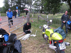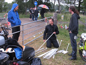 Meanwhile Erwin (on the left, with sidecar) and Saks (on the right, with beer) arrived. Brave (reckless?) Erwin started to put up his marquee. Because it had started raining and a BBQ was inevitable. Immediately a guard smurf approached ... |