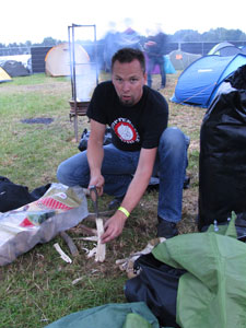 Erwin had his side car fully loaded with tent, BBQ, meat, bear, soda, salad and even firewood. Fully equipped. Like a maniac, he prepared our supper. For that he had to chop kindling-wood. "Sit quietly for a moment man, I can not take a picture!" |