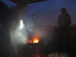 More than once the strong winds and the fierce rain turned the cozy fire into a smoke screen. Saks (on the right) thickened it a bit with a cigarette. |