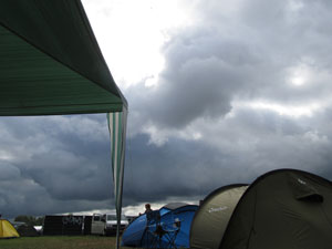 During the downpour the marquees were overcrowded. On the right you see the trophies for the drag racing contest that would be held at 14.00h. Which were canceled because of the weather, of course ... |