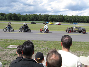 ... until suddenly the sky cleared and the racing could start. Nice to see (and hear!) all those old crates. Nothing beats the sound of a roaring V8 with open exhaust. The biggest surprise , however, was the Vespa in the middle of the picture; no idea what engine it had but it won the sprint from a motorcycle. |