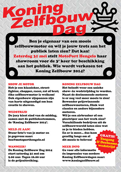 Saturday May 31 2014: another edition of ´Koning Zelfbouw Dag´ (King Bikebuilding Day). An initiative of Goos Bos, owner of Motoport Hengelo, for the third year in a row. Last year I was on the jury of the bikeshow, and this year I was asked again to perform this task. The Netherlands hardly has a stage for private bikemechanics and -designers so of course I agreed. |