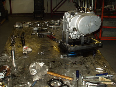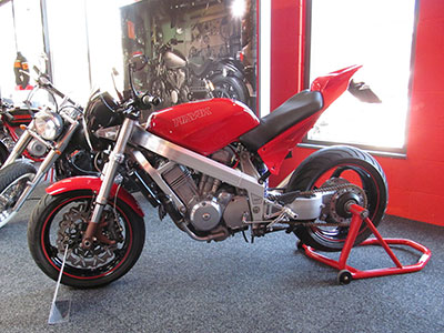 He shows how, in 550 hours (in 1 year!), a meaningless motorcycle - except for the beautiful single-sided front suspension, see picture on the left - transforms into a state of the art sports bike. |