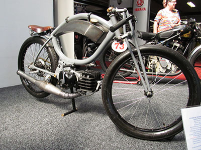 Also a beauty: this minimalist board tracker with a Puch X30-engine from 1976, built by the 17-year-old (!) Haico Heersink. Beautiful curves, and nice how he mounted that tank below the backbone. |