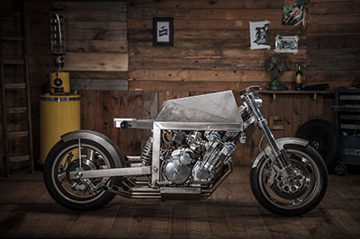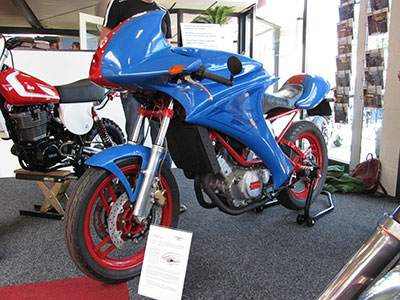 The aerodynamic former Yamaha XZ550 called 'Pteranodon' is built by Marc Brasse. He has been working on it for ten years; all fairing parts are handmade. |