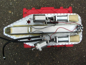Let's take a brief look in the gas tank, in which I made a lot of changes: two Walbro fuel pumps* with four fuel filters and hoses for returned fuel and venting. The complete construction is bolted as lid to the bottom of the gas tank. Never to see daylight again. I hope. * these fuel pumps deliver 255 liters per hour each; at full throttle a V8 is very thirsty. |
