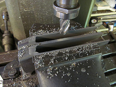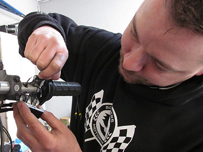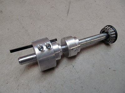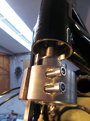 The steering head tube was not perfectly round anymore, not perfect enough for fitting the bearings anyway. Klaus and me constructed a special tool to scratch out the tube. |